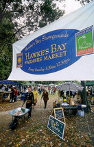 Hawke's Bay Farmer's Market As part of the Harvest Hawke's Bay Wine Festival, we attended the local Farmer's Market. Here we had great coffee and tasted a lot of wonderful foods. You could buy ostrich eggs and venison or ostrich burgers. They had a Simon and Garfunkle type band and even a clown. We bought olives, olive oil, dukkah, walnut bread, tomatoes, avocado, white peaches, and a beautiful salad mix with nasturtiums for a picnic at a winery later in the day.